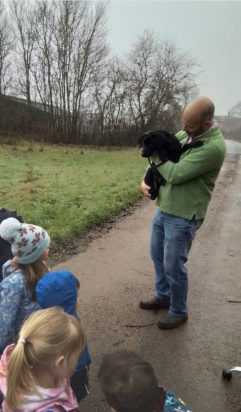 Our Toddlers and Preschool children then went on a walk to the duck pond to see what birds they could spot. Although they only managed to see one duck, they could hear many birds singing in the distance. The children enjoyed stopping to listen carefully to the birdsong and talking about the different sounds they could hear. To make the walk even more exciting, Farmer Jake surprised us by bringing out his Labrador puppy, Cally, to say hello, which brought lots of excitement.